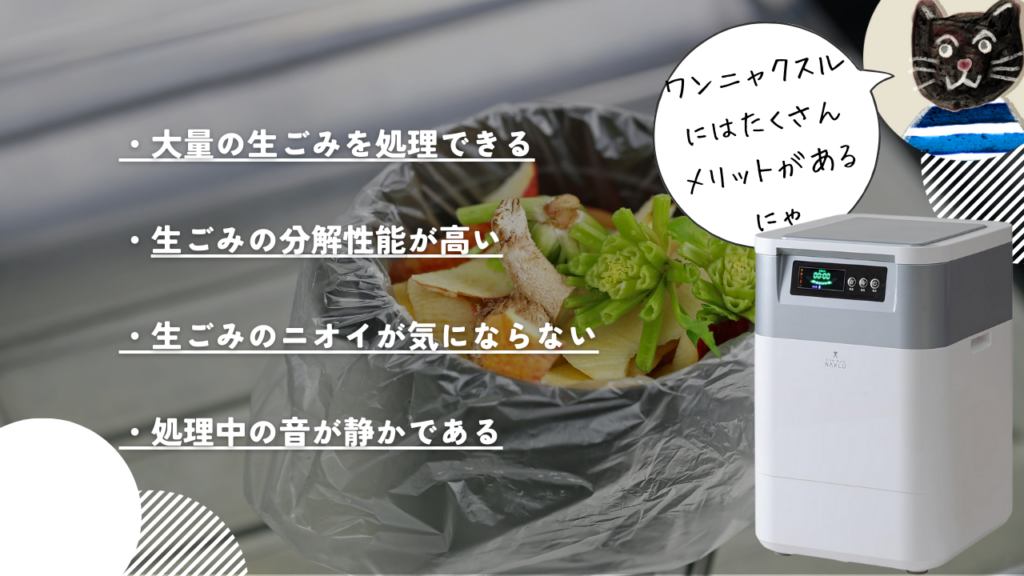 生ごみ処理機ワンニャクスルの口コミ・評判を見ると、ワンニャクスルには数々のメリットがあることが分かります。以下、よく評価されているワンニャクスルのメリットをまとめました。